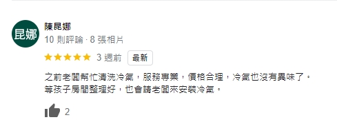 之前老闆幫忙清洗冷氣,服務專業,價格合理,冷氣也沒有異味了。